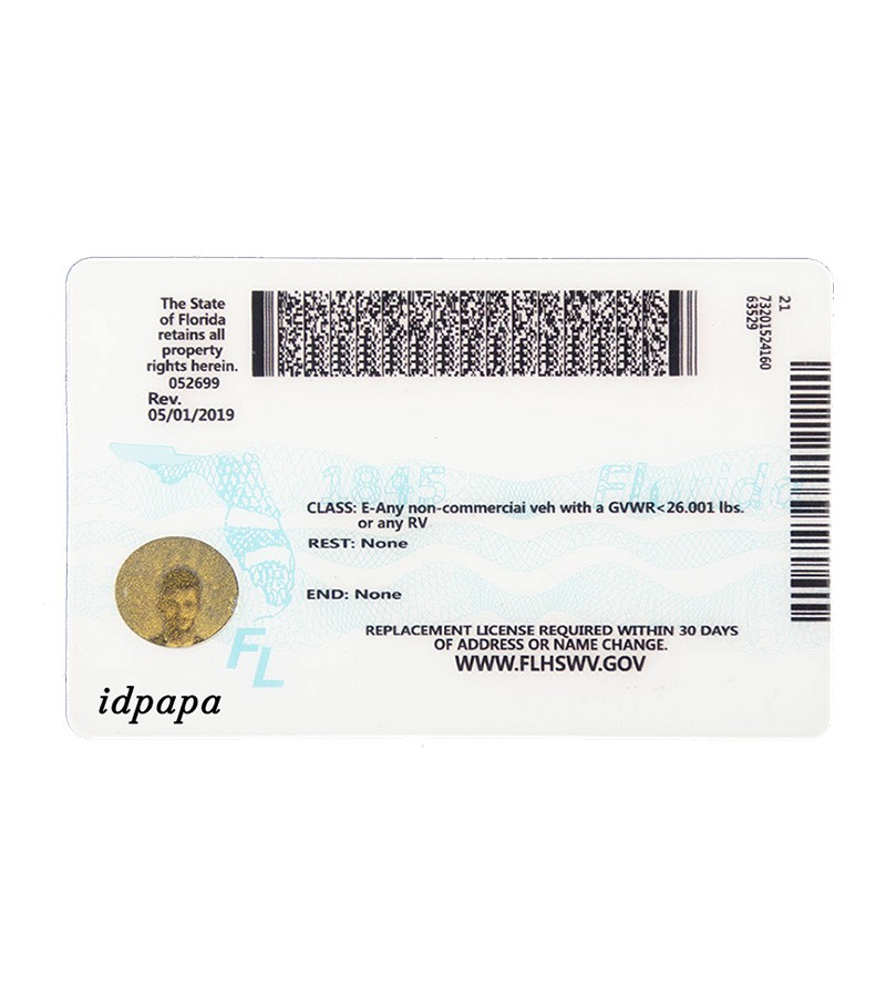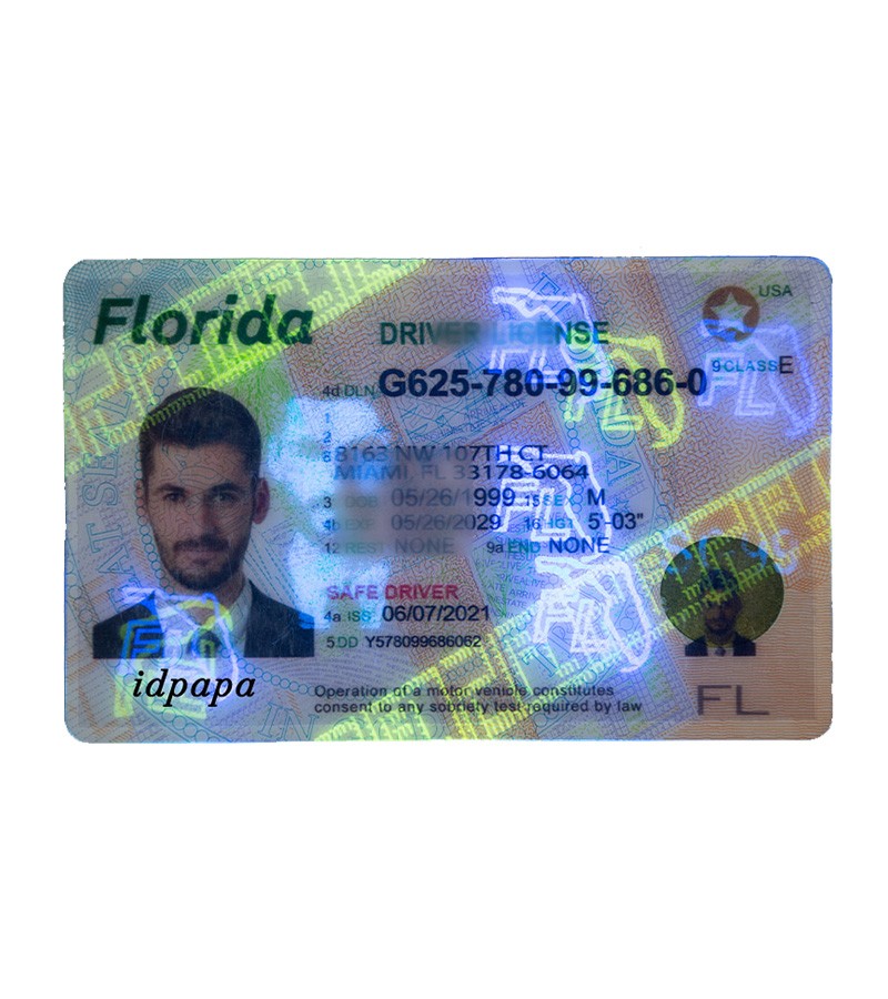 Florida IDs are commonly printed on durable PVC or polycarbonate using high-resolution printing technology.